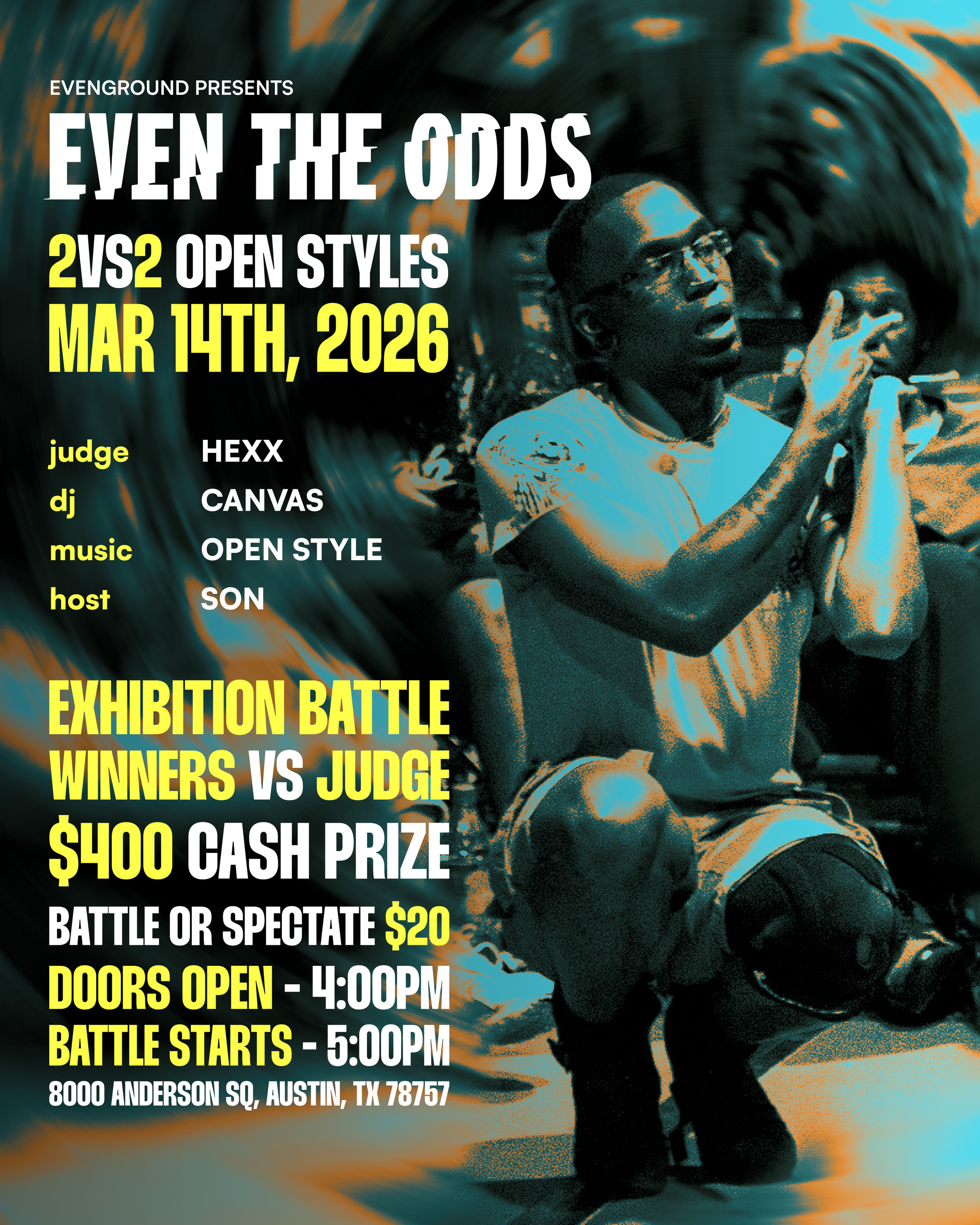 Even The Odds is a freestyle dance battle event series in Austin, TX. The battle format and music changes to maintain variety and keep the battles fresh. We have held over 10 successful battles so far, drawing in people from all over Texas, with our last battle reaching over 100+ attendees.